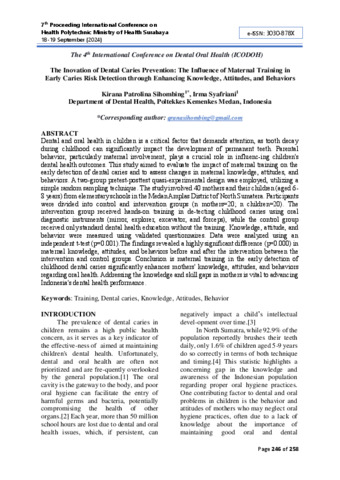 Kirana Patrolina Sihombing, Kirana and Irma Syafriani, Irma (2024) The Inovation of Dental Caries Prevention: The Influence of Maternal Training in Early Caries Risk Detection through Enhancing Knowledge, Attitudes, and Behaviors. The Inovation of Dental Caries Prevention: The Influence of Maternal Training in Early Caries Risk Detection through Enhancing Knowledge, Attitudes, and Behaviors. ISSN 3030-878X