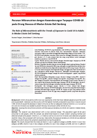 Tarigan, Novriani and Siahaan, Ginta and Nasution, Erlina (2022) Peranan Mikronutrien dengan Kecenderungan Terpapar COVID-19 pada Orang Dewasa di Medan Estate DelThe Role of Micronutrients with the Trends of Exposure to Covid-19 in Adults in Medan Estate Deli Serdang. Peranan Mikronutrien dengan Kecenderungan Terpapar COVID-19 pada Orang Dewasa di Medan Estate Deli Serdang The Role of Micronutrients with the Trends of Exposure to Covid-19 in Adults in Medan Estate Deli Serdang, 6 (1SP). pp. 85-91. ISSN 25809776