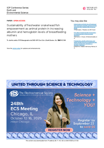 Simanjuntak, R and Siahaan, Ginta and Sihotang, Urbanus and Bakara, Tiar Lince (2024) Sustainability of freshwater snakehead fish empowerment as animal protein in increasing albumin and hemoglobin levels of breastfeeding mothers. Sustainability of freshwater snakehead fish empowerment as animal protein in increasing albumin and hemoglobin levels of breastfeeding mothers.