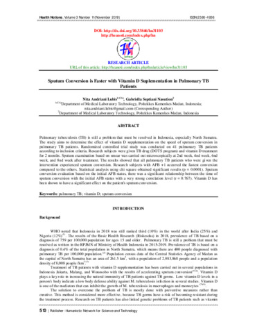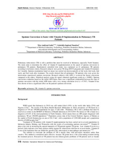 Nita Andriani Lubis, NAL and Gabriella Septiani Nasution, GSN (2019) Sputum Conversion is Faster with Vitamin D Suplementation in Pulmonary TB Patients. Sputum Conversion is Faster with Vitamin D Suplementation in Pulmonary TB Patients, 3 (1): 1. pp. 510-516. ISSN 2580-4936