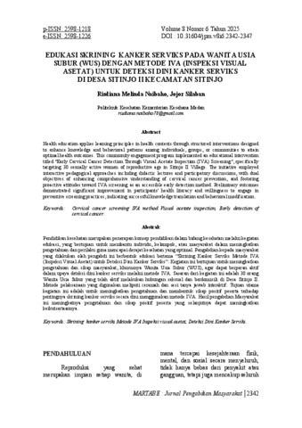NAIBAHO, RISDIANA MELINDA and SILABAN, JOJOR (2025) EDUKASI SKRINING KANKER SERVIKS METODE IVA (INSPEKSI VISUAL ASETAT) UNTUK DETEKSI DINI KANKER SERVIKS PADA WANITA USIA SUBUR (WUS) DI DESA SITINJO II KECAMATAN SITINJO. EDUKASI SKRINING KANKER SERVIKS METODE IVA (INSPEKSI VISUAL ASETAT) UNTUK DETEKSI DINI KANKER SERVIKS PADA WANITA USIA SUBUR (WUS) DI DESA SITINJO II KECAMATAN SITINJO, 8 (6): 9. pp. 2432-2347. ISSN 2598-1218