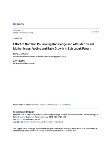 Masthalina, Herta (2018) Effect of Nutrition Counseling Knowledge and Attitude Toward Mother breastfeeding and Baby Growth in Sub Lubuk Pakam. Nutrition Counseling toward Knowledge and Attitude of Breastfeeding Mothers and Infant Growth in Lubuk Pakam Subdistrict, 12 (3). pp. 127-133. ISSN 2460-0601