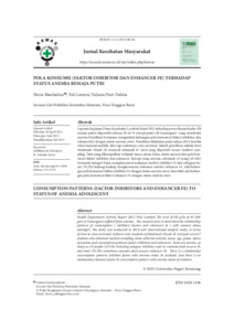Laporan kegiatan Dinas Kesehatan Lombok Barat 2012 terhadap pemeriksaan kadar Hb remaja puteri diperoleh sebesar 83,16 % remaja puteri di Gunungsari yang menderita anemia.Penelitian bertujuan mengetahui hubungan pola konsumsi (faktor inhibitor dan enhancerfe) dengan status anemia siswi. Penelitian dilakukan pada tahun 2014 bersifat observasional analitik, dari segi waktunya cross-sectional. Subjek penelitian adalah siswi Madrasah Aliyah Al-Aziziyah sebanyak 67 siswi yang diperoleh secara random sam-pling. Data yang dikumpulkan meliputi nama, umur, kelas, status anemia dan pola kon-sumsi faktor inhibitor dan enhancer. Remaja yang anemia, sebanyak 10 orang (47,6%) termasuk kategori biasa mengkonsumsi makanan sumber inhibitor Fe dan sebagian be-sar (76,2%) kadang-kadang mengkonsumsi makanan sumber enhancer Fe. Ada hubun-gan pola konsumsi faktor inhibitor Fe dengan status anemia siswi, dan tidak ada hubun-gan pola konsumsi faktor enhancer Fe dengan status anemia siswi.