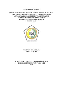 Simarmata, Wahyuni (2020) LITERATURE REVIEW : ASUHAN KEPERAWATAN PADA ANAK DEMAM THYPOID DENGAN MASALAH HIPERTERMIA MENGGUNAKAN KOMPRES BAWANG MERAH DI RUMAH SAKIT UMUM DAERAH PANDAN KABUPATEN TAPANULI TENGAH TAHUN 2020. Diploma thesis, Poltekkes Kemenkes Medan.