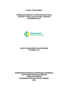 ARITONANG, GLORYA MARGARETHA ARITONANG (2024) FORMULASI SEDIAAN LOTION EKSTRAK BUAH ALPUKAT (Persea americana Mill.) SEBAGAI PELEMBAB KULIT. Diploma thesis, Poltekkes Kemenkes Medan.