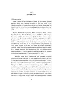 Angka Kematian Ibu (maternal mortality rate) merupakan jumlah kematian ibu dari proses kehamilan,persalianan,dan pasca persalinan yang dijadikan indikator dari kesehatan perempuan. Angka Kematian Ibu merupakan salah satu target global Sutainable Development Goals (SDGS) dalam menurunkan angka kematian ibu menjadi 70 per 100.000 kelahiran hidup.