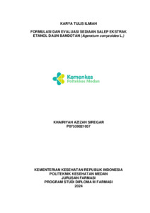 SIREGAR, KHAIRIYAH AZIZAH SIREGAR (2024) FORMULASI DAN EVALUASI SEDIAAN SALEP EKSTRAK ETANOL DAUN BANDOTAN (Ageratum conyzoides L.). Diploma thesis, Poltekkes Kemenkes Medan.
