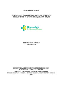 Siagian, Krisdayanti (2025) PEMERIKSAAN KADAR HEMOGLOBIN PADA PENDERITA DEMAM TIFOID DI RSUD Dr. RM. DJOELHAM BINJAI. Diploma thesis, Poltekkes Medan.