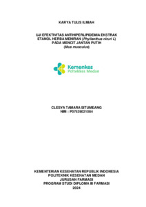 SITUMEANG, CLESYA TAMARA SITUMEANG (2024) EFEKTIVITAS ANTIHIPERLIPIDEMIA EKSTRAK HERBA MENIRAN (Phyllanthus niruri L) TERHADAP MENCIT JANTAN PUTIH (Mus musculus). Diploma thesis, Poltekkes Kemenkes Medan.