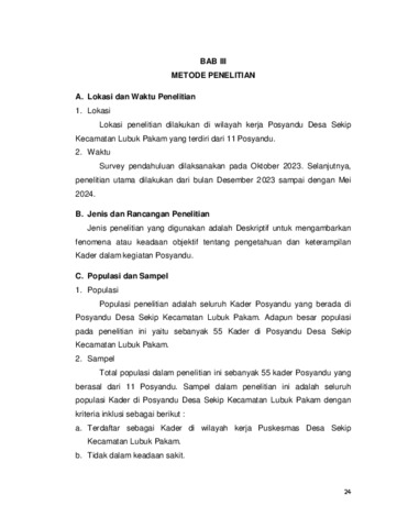 mengambarkan fenomena atau keadaan objektif tentang pengetahuan dan keterampilan Kader dalam kegiatan Posyandu. Dilaksanakan pada Oktober 2023 hingga Mei 2024 dengan sampel 55 orang. Hasil penelitian menunjukan Pengetahuan kader pada kategori baik sebanyak 55 responden, kader berpengetahuan baik sebanyak 14 orang (25,5%), pengetahuan cukup sebanyak 33 orang (60,0%) dan berpengetahuan kurang sebanyak 8 orang (14,5%). Dan keterampilan kader dalam melakukan antropometri sebanyak 55 orang (100,0%) pada kategori tidak terampil.