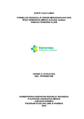 HANISA S. DIYAULHAQ, HANISA S. DIYAULHAQ (2024) FORMULASI SEDIAAN LIP CREAM MENGGUNAKAN SARI BUAH SEMANGKA MERAH (Citrullus lanatus) SEBAGAI PEWARNA ALAMI. Diploma thesis, Poltekkes Kemenkes Medan.