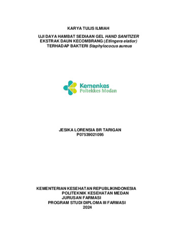 BR TARIGAN, JESIKA LORENSIA BR TARIGAN (2024) UJI DAYA HAMBAT SEDIAAN GEL HAND SANITIZER EKSTRAK DAUN KECOMBRANG (Etlingera elatior) TERHADAP BAKTERI Staphylococu saureus. Diploma thesis, Poltekkes Kemenkes Medan.