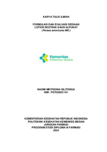SILITONGA, NAOMI MEITHONIA SILITONGA (2024) FORMULASI DAN EVALUASI SEDIAAN LOTION EKSTRAK DAUN ALPUKAT (Persea americana Mill.). Diploma thesis, Poltekkes Kemenkes Medan.