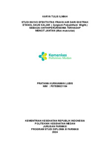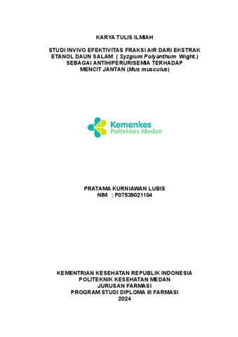 LUBIS, PRATAMA KURNIAWAN LUBIS (2024) UJI STUDI INVIVO EFEKTIVITAS FRAKSI AIR DARI EKSTRAK ETANOL DAUN SALAM (Syzgium polyanthum Wight) SEBAGAI ANTIHIPERURISEMIA TERHADAP MENCIT JANTAN (Mus musculus). Diploma thesis, Poltekkes Kemenkes Medan.
