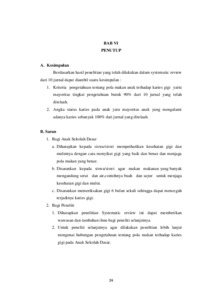 maksud tertentu seperti mempertahankan kesehatan, status nutrisi.Dalam menjaga kesehatan gigi dan mulut dipengaruhi salah satunya oleh pengetahuan.Pada umumnya Anak Sekolah Dasar suka mengonsumsi makanan yang manis dan lengket yang mengakibatkan terjadinya karies gigi. Jenis penelitian yang digunakan adalah systematic review yang bertujuan