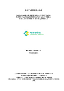 Rizka, Ramadhani (2025) GAMBARAN HASIL PEMERIKSAAN TREPONEMA PALLIDUM HEMAGGLUTINATION ASSAY (TPHA) PADA IBU HAMIL DI RSU HAJI MEDAN. Diploma thesis, Poltekkes Medan.