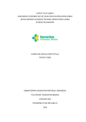 NAPITUPULU, CHRISTINE NATALIA (2024) HUBUNGAN KONSUMSI SAYUR, BUAH DAN ASUPAN ASAM LEMAK JENUH DENGAN KEJADIAN TEKANAN DARAH PADA LANSIA DI DESA TELAGASARI. Diploma thesis, Poltekkes Kemenkes Medan.