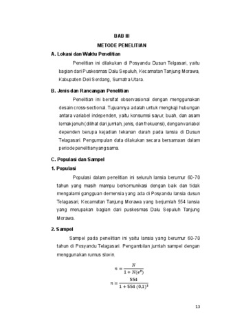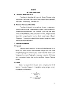 Jenis penelitian ini menggunakan metode deskritif observasional dengan rancangan cross sectional. Populasi dalam penelitian ini seluruh lansia di Desa Telagasari berumur 60-70 tahun sebanyak 554 orang dan sampel sebanyak 95 orang. Waktu penelitian dilakukan dari bulan Mei 2024.