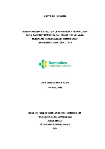 SILALAHI, DIAN ELISABETH (2024) HUBUNGAN ASUPAN PROTEIN DENGAN KADAR HEMOGLOBIN PADA PASIEN PENYAKIT GAGAL GINJAL KRONIK YANG MENJALANI HEMODIALISA DI RUMAH SAKIT UNIVERSITAS SUMATERA UTARA. Diploma thesis, Poltekkes Kemenkes Medan.