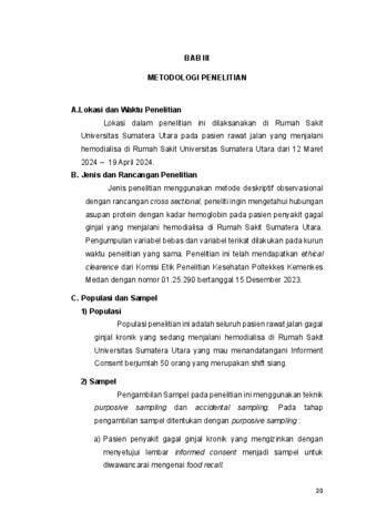 akan hilang pada saat melakukan hemodialisa. Sehingga perlunya peningkatan asupan protein untuk pembentukan eritrosit dengan hemoglobin didalam tubuh. Penelitian ini bertujuan untuk mengetahui hubungan asupan protein dengan kadar hemoglobin pada pasien penyakit gagal ginjal kronik yang menjalani Hemodialisa di Rumah Sakit Universitas Sumatera Utara. Jenis penelitian menggunakan Metode Deskriptif Observasional dengan rancangan cross sectional. Populasi dalam penelitian adalah pasien penyakit gagal ginjal kronik yang menjalani hemodialisa pada shift