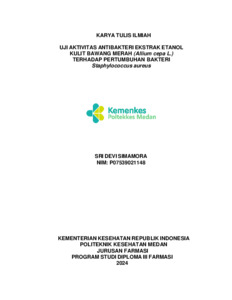 SIMAMORA, SRI DEVI SIMAMORA (2024) UJI AKTIVITAS ANTIBAKTERI EKSTRAK ETANOL KULIT BAWANG MERAH (Allium cepa L.) TERHADAP PERTUMBUHAN BAKTERI Staphylococcus aureus. Diploma thesis, Poltekkes Kemenkes Medan.
