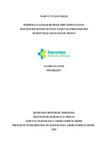 Gultom, Naomi (2025) PERBEDAAN KADAR HEMOGLOBIN SEBELUM DAN SESUDAH KEMOTERAPI PADA PASIEN KANKER SERVIKS DI RSUP HAJI ADAM MALIK MEDAN. Diploma thesis, Poltekkes Medan.