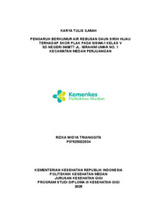 TRIANGGITA, RIZKA WIDYA (2025) PENGARUH BERKUMUR AIR REBUSAN DAUN SIRIH HIJAU TERHADAP SKOR PLAK PADA SISWA/I KELAS V SD NEGERI 060877 JL. IBRAHIM UMAR NO. 1 KECAMATAN MEDAN PERJUANGAN. Diploma thesis, Poltekkes Kemenkes Medan.