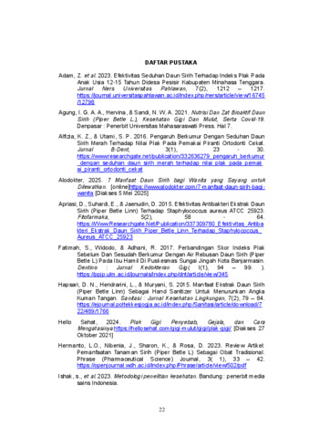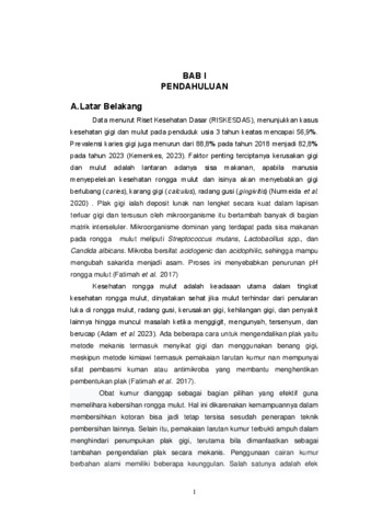 Masalah kesehatan gigi dan mulut di Indonesia masih tergolong tinggi, dengan plak sebagai faktor utama penyebab gangguan seperti karies dan radang gusi. Plak terbentuk dari akumulasi mikroorganisme yang menempel pada permukaan gigi. Salah satu alternatif pengendalian plak adalah penggunaan obat kumur berbahan alami, seperti daun sirih hijau (Piper betle L.), yang dikenal memiliki kandungan antibakteri seperti eugenol, kavikol, dan minyak atsiri.