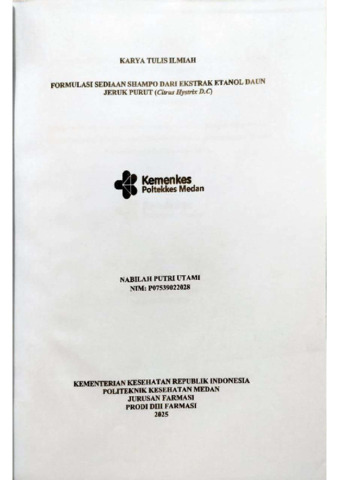 Nabilah Putri Utami, Nabilah Putri Utami (2025) FORMULASI SEDIAAN SHAMPO DARI EKSTRAK ETANOL DAUN JERUK PURUT (Citrus Hystrix D.C). Diploma thesis, Poltekkes Kemenkes Medan.