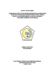 Nasution, Risma (2023) Gambaran Efektivitas Mengkonsumsi Buah Semangka Terhadap Penurunan Debris Indeks Pada Siswa/I Kelas V di SD Negeri 068003 Jalan Kayu Manis 1 Kecamatan Medan Tuntungan. Diploma thesis, Poltekkes Kemenkes Medan.