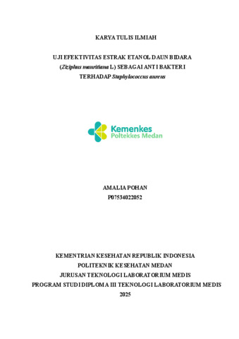 Pohan, Amalia (2025) UJI EFEKTIVITAS ESTRAK ETANOL DAUN BIDARA (Ziziphus mauritiana L) SEBAGAI ANTI BAKTERI TERHADAP Staphylococcus aureus. Diploma thesis, Poltekkes Medan.