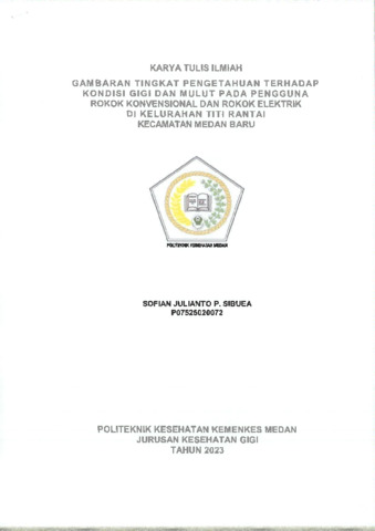 Sibuea, Sofian Julianto P. (2023) Gambaran Tingkat Pengetahuan Terhadap Kondisi Gigi dan Mulut Pada Pengguna Rokok Konvensional dan Rokok Elektrik di Kelurahan Titi Rantai Kecamatan Medan Baru. Diploma thesis, Poltekkes Kemenkes Medan.