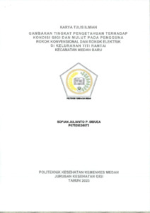 bertujuan untuk mengetahui gambaran tingkat pengetahuan terhadap kondisi gigi dan mulut pada pengguna rokok konvensional dan rokok elektrik. Jumlah sampel sebanyak 30 orang. Pengambilan data diperoleh melalui pengisian kuesioner dan pemeriksaan gigi dan mulut.