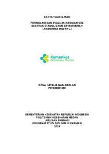 NAINGGOLAN, DONA NATALIA NAINGGOLAN (2024) FORMULASI DAN EVALUASI SEDIAAN GEL EKSTRAK ETANOL DAUN BAYAM MERAH (Amaranthus tricolor L.). Diploma thesis, Poltekkes Kemenkes Medan.