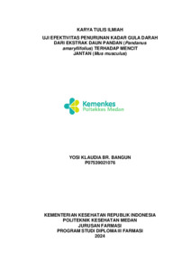 BR. BANGUN, YOSI KLAUDIA BR. BANGUN (2024) UJI EFEKTIVITAS PENURUNAN KADAR GULA DARAH DARI EKSTRAK DAUN PANDAN (Pandanus amaryllifolius TERHADAP MENCIT JANTAN (Mus musculus). Diploma thesis, Poltekkes Kemenkes Medan.