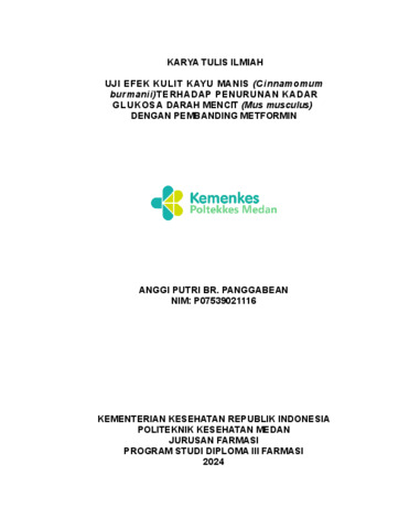 BR. PANGGABEAN, ANGGI PUTRI BR. PANGGABEAN (2024) UJI EFEK KULIT KAYU MANIS (Cinnamomum burmanii) TERHADAP PENURUNAN KADAR GLUKOSA DARAH MENCIT (Mus musculus) DENGAN PEMBANDING METFORMIN. Diploma thesis, Poltekkes Kemenkes Medan.