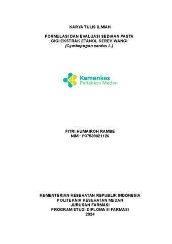RAMBE, FITRI HUMAIROH RAMBE (2024) FORMULASI DAN EVALUASI SEDIAAN PASTA GIGI EKSTRAK ETANOL SEREH WANGI (Cymbopogon nardus L.). Diploma thesis, Poltekkes Kemenkes Medan.