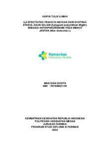 WAN DIAN SUGITA, WAN DIAN SUGITA (2024) UJI EFEKTIVITAS FRAKSI N-HEKSAN DARI EKSTRAK ETANOL DAUN SALAM (Syzygium polyanthum Wight.) SEBAGAI ANTIHIPERURISEMIA PADA MENCIT JANTAN (Mus musculus L). Diploma thesis, Poltekkes Kemenkes Medan.