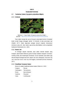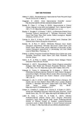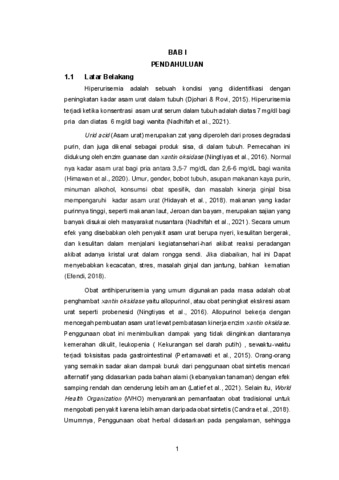 Hiperurisemia adalah suatu keadaan terjadinya peningkatan kadar serum asam urat dalam darah untuk pria > 7mg/dL dan untuk wanita > 6 mg/dl. Daun Salam (Syzygium polyanthum Wight.) mengandungan flavonoid yang dapat menghambat kerja enzim hipoxantin dan menyebabkan terhambatnya