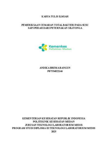 Andika, Brema (2025) PEMERIKSAAN CEMARAN TOTAL BAKTERI PADA SUSU SAPI PERAH DARI PETERNAKAN SILITONGA. Diploma thesis, Poltekkes Medan.