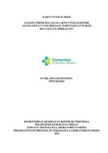 Sitompul, Putri Aisyah (2025) ANALISA PRODUKSI ASAM LAKTAT PADA BAKTERI ASAM LAKTAT YANG BERASAL DARI FASES LUWAK DI KECAMATAN SIDIKALANG. Diploma thesis, Poltekkes Medan.