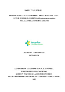 Siregar, Roudotul Ulfa (2025) ANALISIS INTERAKSI BAKTERI ASAM LAKTAT (BAL) ASAL FESES LUWAK DI SIDIKALANG DENGAN Pseudomonas aeruginosa MELALUI MEKANISME KOAGREGASI. Diploma thesis, Poltekkes Medan.