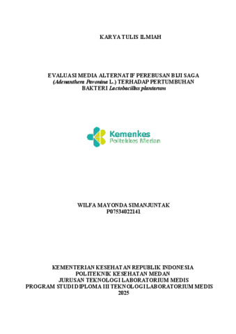 Simanjuntak, Wilfa Mayonda (2025) EVALUASI MEDIA ALTERNATIF PEREBUSAN BIJI SAGA (Adenanthera Pavonina L.) TERHADAP PERTUMBUHAN BAKTERI Lactobacillus plantarum. Diploma thesis, Poltekkes Medan.