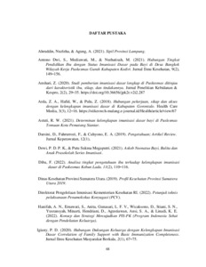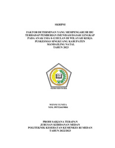 Yunita, Wenni (2023) FAKTOR DETERMINAN YANG MEMPENGARUHI IBU TERHADAP PEMBERIAN IMUNISASI DASAR LENGKAP PADA ANAK USIA 0-12 BULAN DI WILAYAH KERJA PUSKESMAS SINGKUANG KABUPATEN MANDAILING NATAL TAHUN 2023. Diploma thesis, Poltekkes Kemenkes Medan.