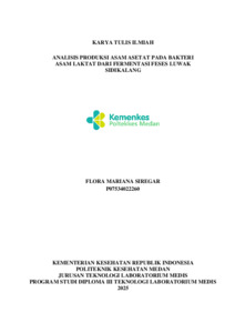 Siregar, Flora Mariana (2025) ANALISIS PRODUKSI ASAM ASETAT PADA BAKTERI ASAM LAKTAT DARI FERMENTASI FESES LUWAK SIDIKALANG. Diploma thesis, Poltekkes Medan.