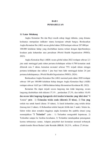 Angka Kematian Ibu dan Bayi masih cukup tinggi didunia, yang dimana keduanya merupakan indikator utama kemajuan sebuah bangsa. Berdasarkan Angka Kematian Ibu (AKI) nasional pada tahun 2020 terdapat sebesar 189 per 100.000 kelahiran hidup dengan Angka Kematian Bayi (AKB) terdapat sebesar 16,85 per