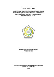 SITUMORANG, ASIMA KRISTIN SITUMORANG (2023) UJI EFEK ANTIBAKTERI EKSTRAK ETANOL DAUN RUKU-RUKU (Ocimum tenuiflorum L.) TERHADAP PERTUMBUHAN BAKTERI Escherichia coli SECARA DIFUSI AGAR. Diploma thesis, Poltekkes Kemenkes Medan.