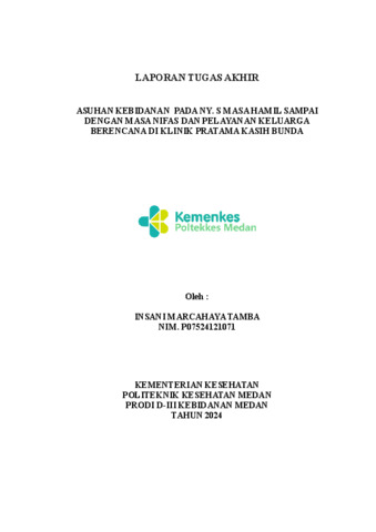 Tamba, Insani Marcahaya (2024) Asuhan Kebidanan Pada Ny. S Masa Hamil Sampai Dengan Masa Nifas Dan Pelayanan Keluarga Berencana Di Klinik Pratama Kasih Bunda. Diploma thesis, Poltekkes Kemenkes Medan.