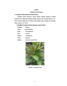 Pirdot (Saurauia vulcani Korth.) merupakan tanaman obat tradisional yang banyak dimanfaatkan masyarakat untuk pengobatan berbagai penyakit, diketahui bahwa ekstrak daun pirdot mengandung alkaloid, flavonoid, tannin, saponin, steroid/terpenoid dengan menggunakan pelarut etanol. Daun pirdot memiliki potensi sebagai antibakteri, antijamur, dan antidiabetes. Penelitian ini bertujuan untuk mengkarakterisasi simplisia daun pirdot dan melakukan skrining fitokimia untuk mengidentifikasi golongan senyawa kimia yang terkandung didalamnya.