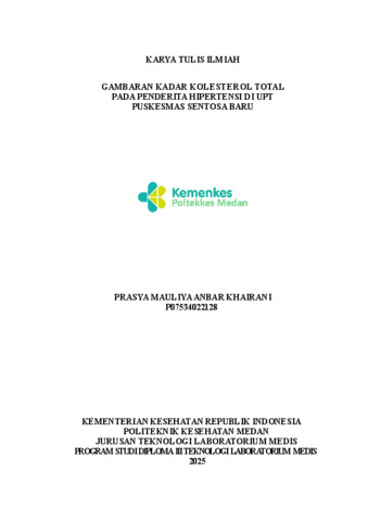 Prasya, Mauliya Anbar Khairani (2025) GAMBARAN KADAR KOLESTEROL TOTAL PADA PENDERITA HIPERTENSI DI UPT PUSKESMAS SENTOSA BARU. Diploma thesis, Poltekkes Kemenkes Medan.